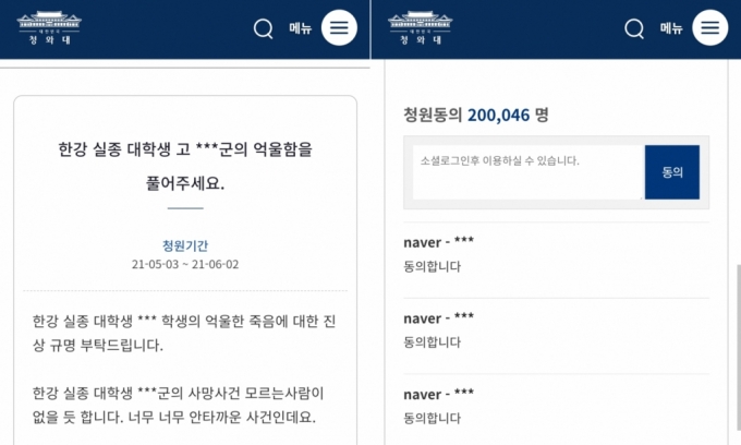 뭐 우리나라는 표현의 자유가 있고 지가 하고싶은말 하는거에 대해서 정부가 개입하는거는 나는 반대, 근데 저런 발언이후 한국 돌아와서 활동한다고 하면 그 결과는 자기들이 책임 져야됨. 청와대 국민청원 게시판은 2017년 8월 17일 문재인 대통령 취임 100일을 기해 출범했다. 이슈 한강 사건 검찰수사 전환 요청 국민청원. 한국여성정책연구원 카드뉴스 우리사회 젠더 이슈, 국민청원 빅데이터 분석에 어떻게 담겨있을까? 21일 청와대 국민청원 게시판에 따르면 지난 19일 '빅히트엔터테인먼트의 공모가격 어떻게 결정되었는지 밝혀주세요'라는 청원글이 게재됐다.